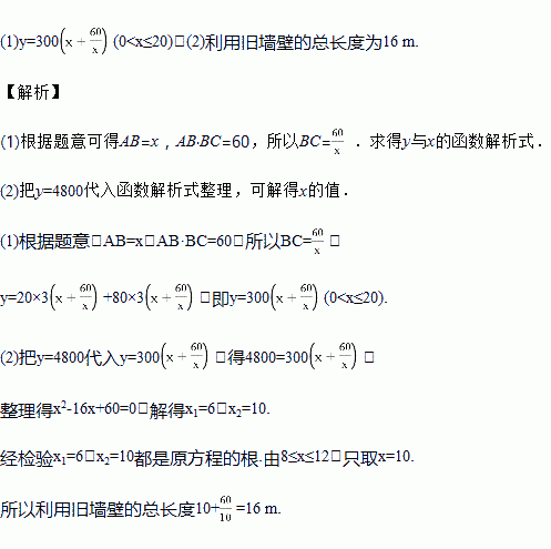 (2)为了合理利用大厅,要求自变量x必须满足条件:8≤x≤12,当投入的资金为4800元时,问利用旧墙壁的总长度为多少?