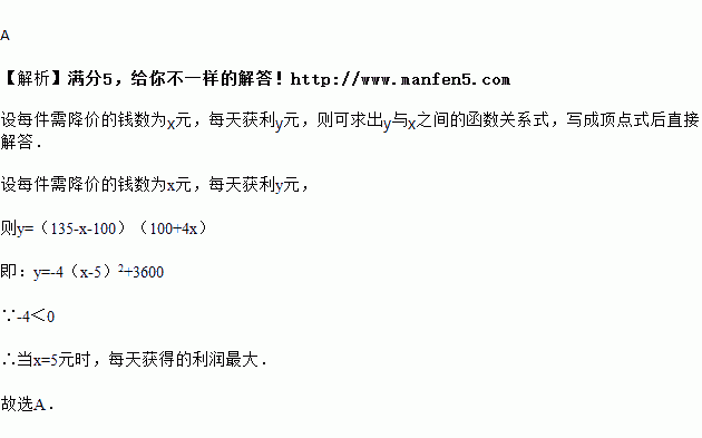 一件工艺品进价为100元,标价135元售出,每天可售出100件.根据销售统计,一件工艺品每降价1元出售,则每天可多售出4件,要使每天获得的利润最大,每件需降价的钱数为( )
