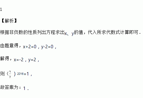 若x,y为实数,且|x+2|+(y﹣2)2=0,则()2016的值为________.