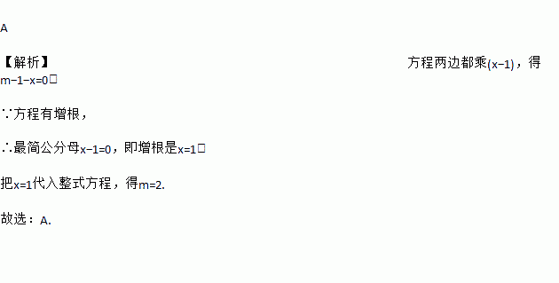 A 【解析】方程两边都乘(x?1),得m?1?x=0, ∵方程有增根, ∴最简公分母x?1=0,即增根是x=1, 把x=1代入整式方程,得m=2. 故选:A.