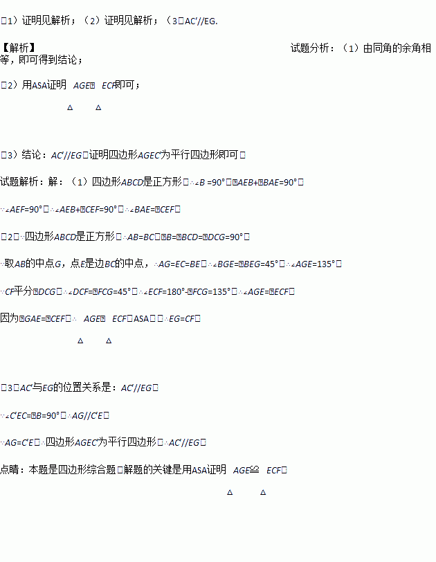 如图1所示,四边形ABCD是正方形,点E是边BC的中点且∠AEF=90°,EF交正方形外角平分线CF于点F,.