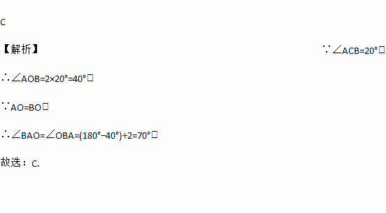 C 【解析】∵∠ACB=20°, ∴∠AOB=2×20°=40°, ∵AO=BO, ∴∠BAO=∠OBA=(180°?40°)÷2=70°, 故选:C.