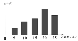 下图是根据这组数据绘制的统计图,图中从左到右长方形的高度之比为2:4:5:8:6.又知此次调查中捐款20元和25元的学生一共28人.