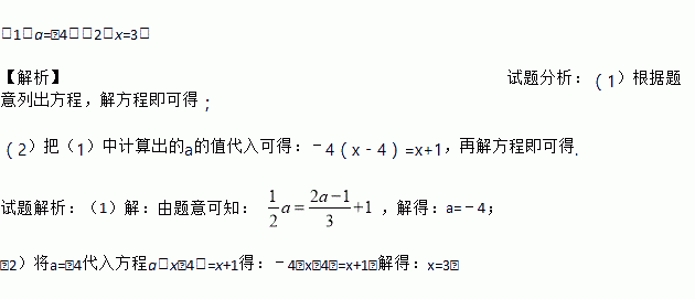 (1)a=﹣4;(2)x=3. 【解析】试题分析:(1)根据题意列出方程,解方程即可得; (2)把(1)中计算出的a的值代入可得:﹣4(x﹣4)=x+1,再解方程即可得. 试题解析:(1)【解析】 由题意可知: ,解得:a=﹣4; (2)将a=﹣4代入方程a(x﹣4)=x+1得:﹣4(x﹣4)=x+1,解得:x=3.