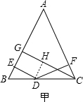 分析:(1)猜想是DE+DF=CG.在CG上截取CH=DE,连接DH,易证四边形GEDH是矩形,从而可知∠GHD=90°,DH∥AB,那么就有∠DHC=∠CFD=90°,∠HDC=∠B,又AB=AC,利用等边对等角,可得∠B=∠FCD,于是∠HDC=∠FCD,再结合CD=DC,利用AAS可证△DHC≌△CFD,那么CH=DF,从而易证DE+DF=CG.
