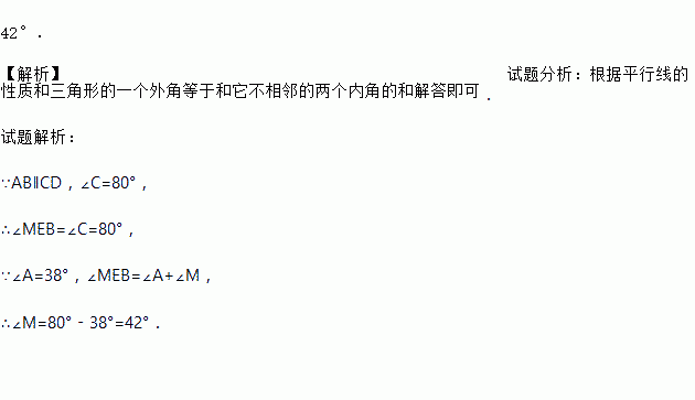 如图,AB∥CD,∠A=38°,∠C=80°,求∠M.