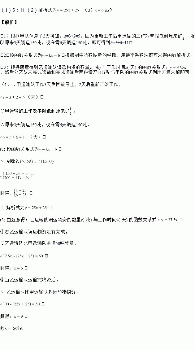 某工厂安排甲、乙两个运输队各从仓库调运物资300吨,两队同时开始工作,甲运输队工作3天后因故停止,2天后重新开始工作,由于工厂调离了部分工人,甲运输的工作效率降低到原来的甲、乙运输队调运物资的数量与甲工作时间的函数图象如图所示.