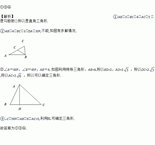 ①AB=3,BC=4,AC=5 ②AB=4,BC=3,∠A=30º