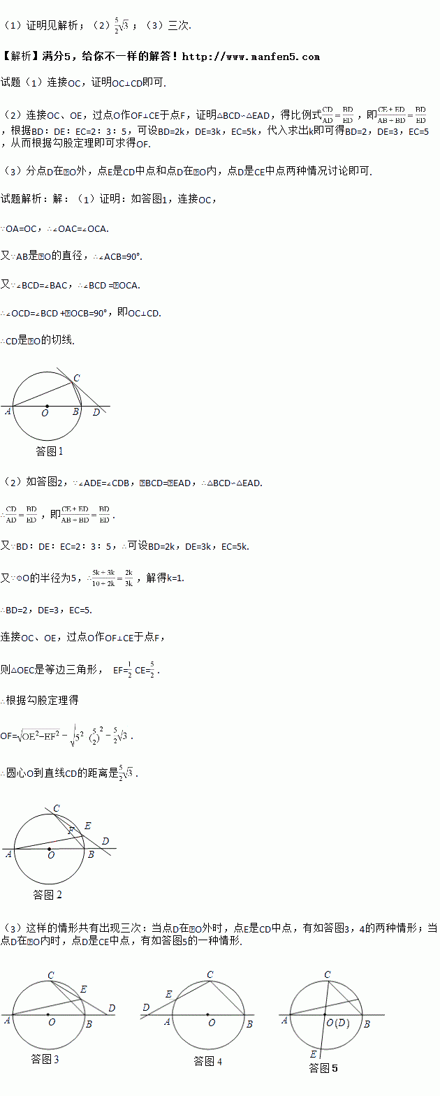 (2)如图(2),CD与⊙O交于另一点E,BD:DE:EC=2;3:5求圆心O到直线CD的距离;