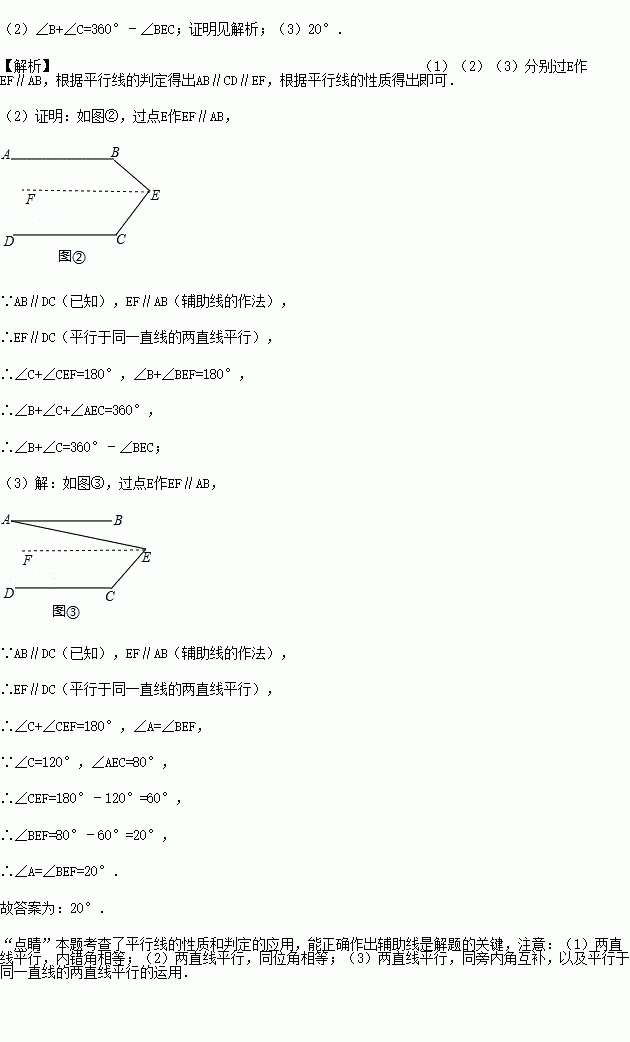 (3)如图③,AB∥DC,∠C=120°,∠AEC=80°,则∠A= .(写出结论,不用写计算过程)。