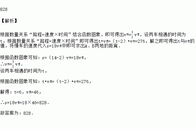 如图是一辆慢车与一辆快车沿相同路线从地到地所行的路程与时间之间的函数图象,已知慢车比快车早出发小时,则、两地的距离为________ .