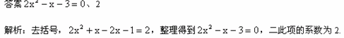 方程(x–1)(2x+1)=2化成一般形式是 ,它的二次项系数是 .