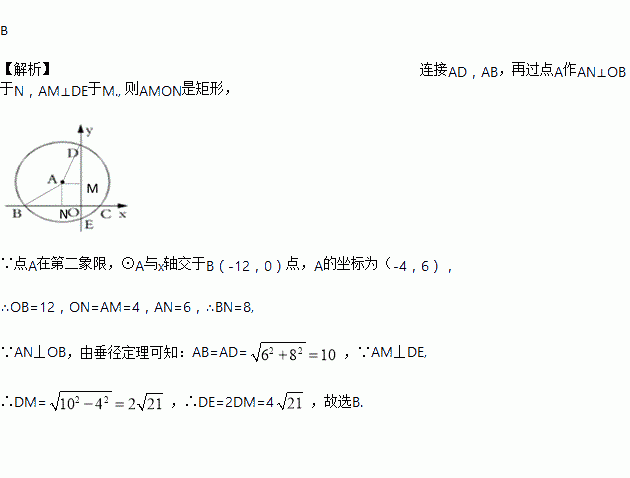 如图,已知⊙A在平面直角坐标系中,⊙A与x轴交于点B,C,与y轴交于点D,E,若圆心A的坐标为(-4,6),点B的坐标为(-12,0),则DE的长度为( )