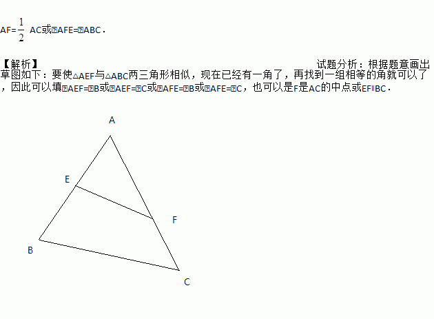 已知:△ABC中,点E是AB边的中点,点F在AC边上,若以A,E, F为顶点的三角形与△ABC相似,则需要增加的一个条件是 .(写出一个即可)