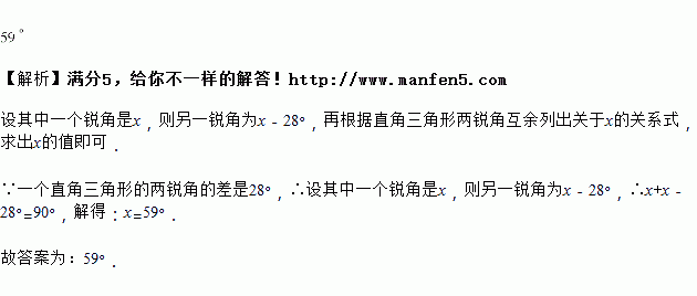 一个直角三角形的两锐角的差是,则其中较大的一个锐角是________.