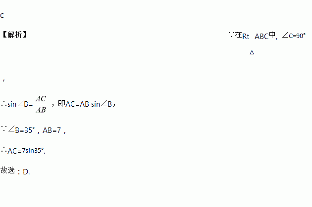 C 【解析】∵在Rt△ABC中, ∠C=90°, ∴sin∠B=,即AC=AB sin∠B, ∵∠B=35°,AB=7, ∴AC=7sin35°. 故选:D.