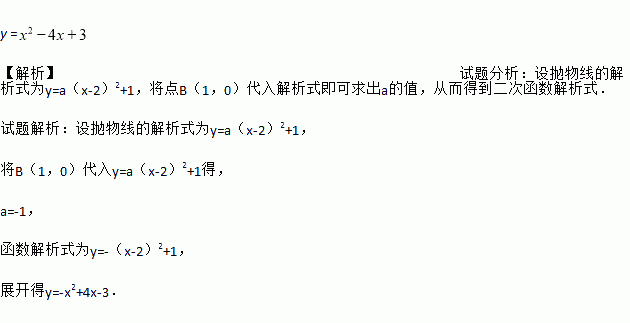 y = 【解析】试题分析:设抛物线的解析式为y=a(x-2)2+1,将点B(1,0)代入解析式即可求出a的值,从而得到二次函数解析式. 试题解析:设抛物线的解析式为y=a(x-2)2+1, 将B(1,0)代入y=a(x-2)2+1得, a=-1, 函数解析式为y=-(x-2)2+1, 展开得y=-x2+4x-3.