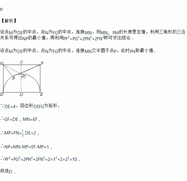 在△ABC中,若O为BC边的中点,则必有:AB2+AC2=2AO2+2BO2成立.依据以上结论,解决如下问题:如图,在矩形DEFG中,已知DE=4,EF=3,点P在以DE为直径的半圆上运动,则PF2+PG2的最小值为( )