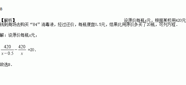 某学校用420元钱到商场去购买“84”消毒液,经过还价,每瓶便宜0.5元,结果比用原价多买了20瓶,求原价每瓶多少元?若设原价每瓶元,则可列出方程为( )