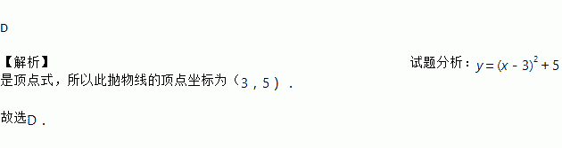 D 【解析】试题分析:y=(x-3)2+5是顶点式,所以此抛物线的顶点坐标为(3,5). 故选D.