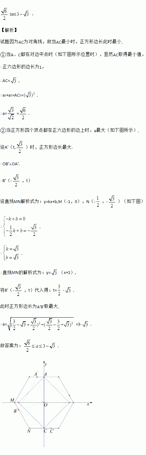 如图,有一个边长不定的正方形ABCD,它的两个相对的顶点A,C分别在边长为1的正六边形一组平行的对边上,另外两个顶点B,D在正六边形内部(包括边界),则正方形边长a的取值范围是 .