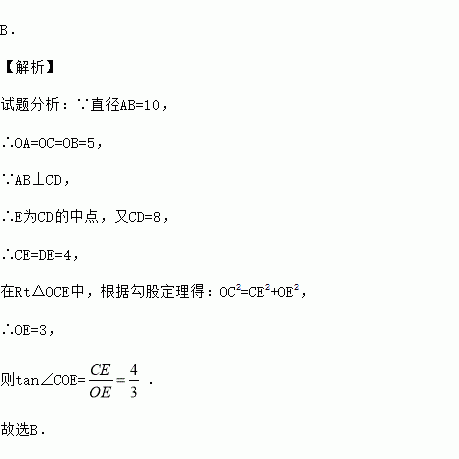 如图,AB是⊙O的直径,弦CD⊥AB于点E,连结OC,若OC=5,CD=8,则tan∠COE=( )