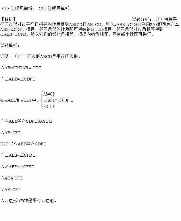 求证:(1)AE=CF;(2)四边形AECF是平行四边形.