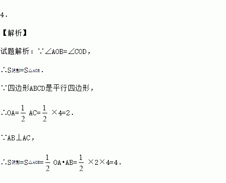 如图,平行四边形ABCD中,AB=AC=4,AB⊥AC,O是对角线的交点,若⊙O过A、C两点,则图中阴影部分的面积之和为 .