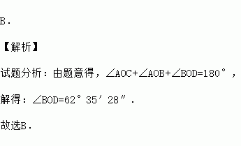 B. 【解析】 试题分析:由题意得,∠AOC+∠AOB+∠BOD=180°, 解得:∠BOD=62°35′28″. 故选B.