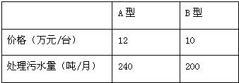 | 新华网广州2月7日电,广东省饮用水源一级保护区—韶关市乳源瑶族自治县南水水库库湾发现疑似污染事件得到控制。事件后,当地政府为了更好治理水库水质,保护环境,市治污公司决定购买10台污水处理设备,现有两种型号的设备,其中每台的价格,月处理污水量如下表: | |||||||||