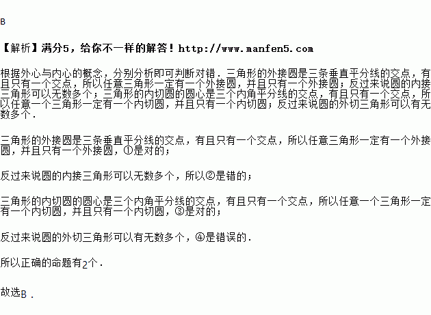 给出下列命题:①任意三角形一定有一个外接圆,并且只有一个外接圆; ②任意一个圆一定有一个内接三角形,并且只有一个内接三角形;③任意一个三角形一定有一个内切圆,并且只有一个内切圆;④任意一个圆一定有一个外切三角形, 并且只有一个外切三角形,其中真命题共有( )