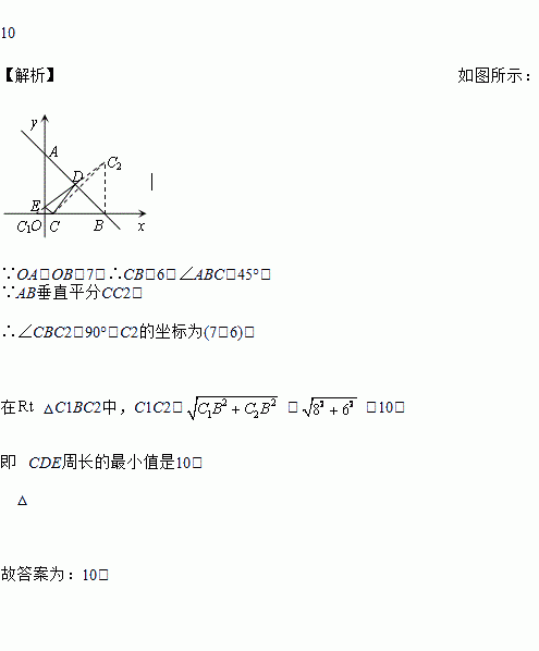 (2016四川省内江市)如图所示,已知点C(1,0),直线y=﹣x+7与两坐标轴分别交于A,B两点,D,E分别是AB,OA上的动点,则△CDE周长的最小值是________.