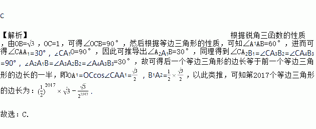 ,0)、C(0,4),在△ABC内依次作等边三角形,使一边在x轴上,另一个顶点在BC边上,作出的等边三角形分别是第1个△AA1B1,第2个△B1A2B2,第3个△B2A3B3,…则第2017个等边三角形的边长等于( )