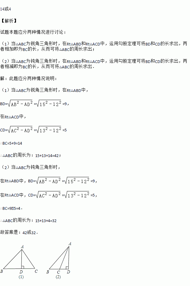 若△ABC中,AB=13,AC=15,高AD=12,则BC的长是______.