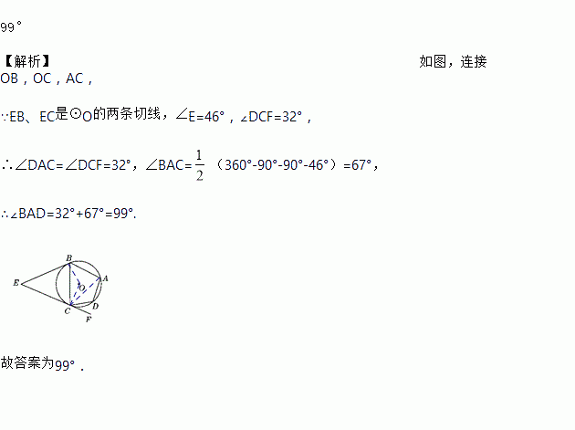 如图,EB,EC是⊙O的两条切线,B,C是切点,A,D是⊙O上两点,如果∠E=46°,∠DCF=32°,那么∠A=________.