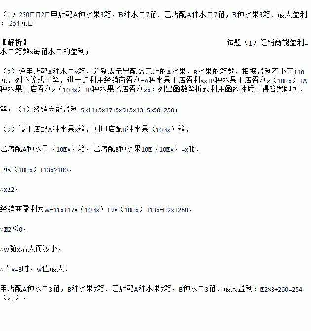 (1)如果甲、乙两店各配货10箱,其中A种水果两店各5箱,B种水果两店各5箱,请你计算出经销商能盈利多少元?