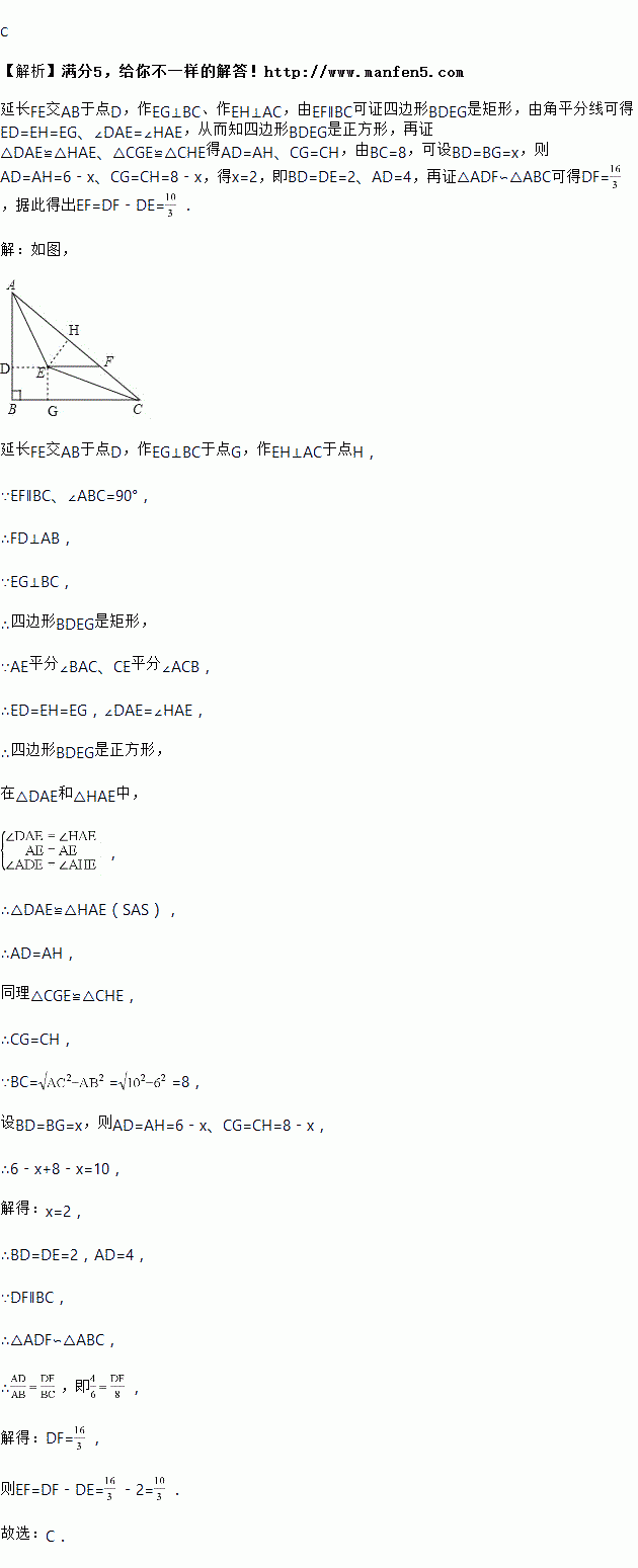如图,在Rt△ABC中,∠ABC=90°,AB=6,BC=8,∠BAC,∠ACB的平分线相交于点E,过点E作EF∥BC交AC于点F,则EF的长为( )