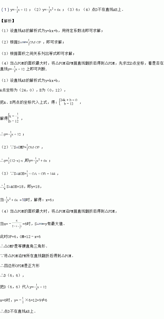 (4)当△POM的面积最大时,将△POM沿PM所在直线翻折后得到△PDM,试判断D点是否在直线AB上,请说明理由.