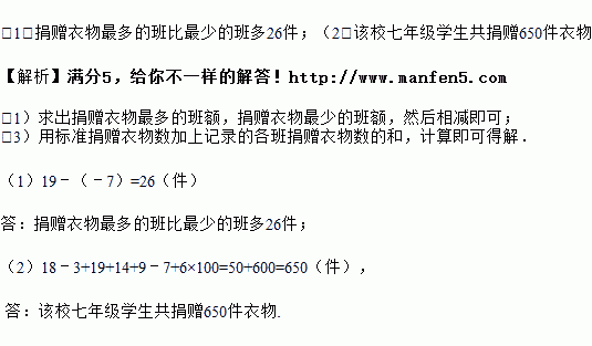 2017年12月,旗团委号召各校组织开展捐赠衣物的“暖冬行动”.某校七年级六个班参加了这次捐赠活动,若每班捐赠衣物以100件为基准,超过的件数用正数表示,不足的件数用负数表示,记录如下: