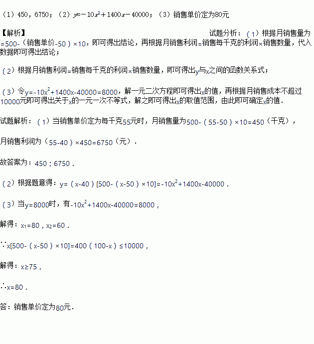 (1)当销售单价定为每千克55元时,月销售量是________千克,月销售利润是________元;