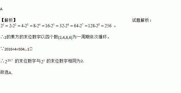 A 【解析】试题解析: , ∴2的乘方的末位数字以四个数(2,4,8,6)为一周期依次循环, ∵2016÷4=504…1, ∴的末位数字与的末位数字相同为2. 故选A.