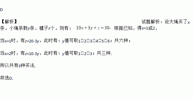 在国家倡导的“阳光体育”活动中,老师给小明30元钱,让他买三样体育用品;大绳,小绳,毽子.其中大绳至多买两条,大绳每条10元,小绳每条3元,毽子每个1元.在把钱都用尽的条件下,买法共有( )