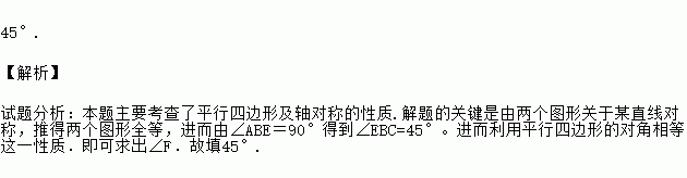 如图,若□ABCD与□EBCF关于BC所在直线对称,且∠ABE=90°,则∠F= °.