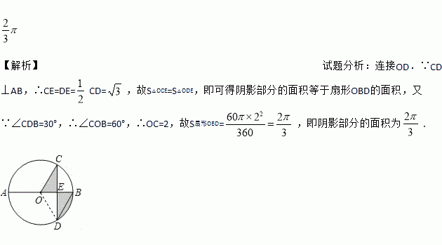 如图,AB是⊙O的直径,弦CD⊥AB于点E,∠CDB=30°,CD=,则阴影部分的面积为_____.(结果保留π)