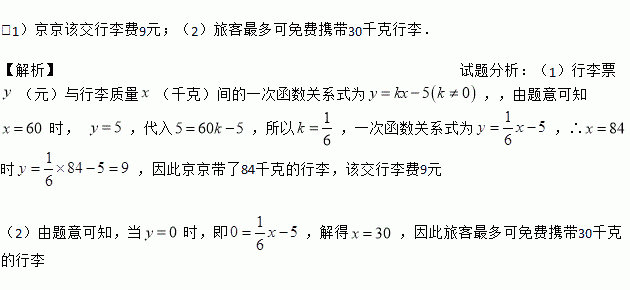 £¨1£©¾©¾©¸Ã½»ÐÐÀî·Ñ9Ôª£»£¨2£©ÂÿÍ×î¶à¿ÉÃâ·ÑЯ´ø30ǧ¿ËÐÐÀ ¡¾½âÎö¡¿ÊÔÌâ·ÖÎö£º£¨1£©ÐÐÀîÆ±£¨Ôª£©ÓëÐÐÀîÖÊÁ¿£¨Ç§¿Ë£©¼äµÄÒ»´Îº¯Êý¹ØÏµÊ½Îª£¬£¬ÓÉÌâÒâ¿É֪ʱ£¬ £¬´úÈ룬ËùÒÔ£¬Ò»´Îº¯Êý¹ØÏµÊ½Îª£¬¡àʱ£¬Òò´Ë¾©¾©´øÁË84ǧ¿ËµÄÐÐÀ¸Ã½»ÐÐÀî·Ñ9Ôª £¨2£©ÓÉÌâÒâ¿ÉÖª£¬µ±Ê±£¬¼´£¬½âµÃ£¬Òò´ËÂÿÍ×î¶à¿ÉÃâ·ÑЯ´ø30ǧ¿ËµÄÐÐÀî