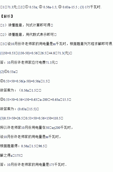 (1)若许老师家10月份的用电量为130千瓦时,则10月份许老师家应付电费多少元?