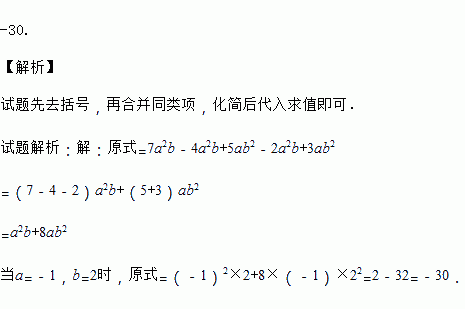 化简求值:7a2b+(-4a2b+5ab2)-(2a2b-3ab2).其中a=-1,b=2.