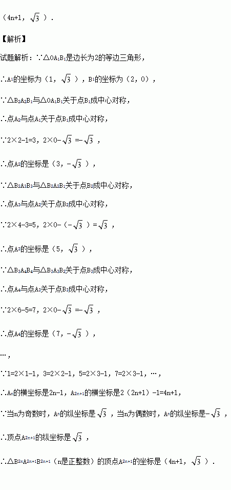 在如图所示的平面直角坐标系中,△OA1B1是边长为2的等边三角形,作△B2A2B1与△OA1B1关于点B1成中心对称,再作△B2A3B3与△B2A2B1关于点B2成中心对称,如此作下去,则△B2nA2n+1B2n+1(n是正整数)的顶点A2n+1的坐标是 .