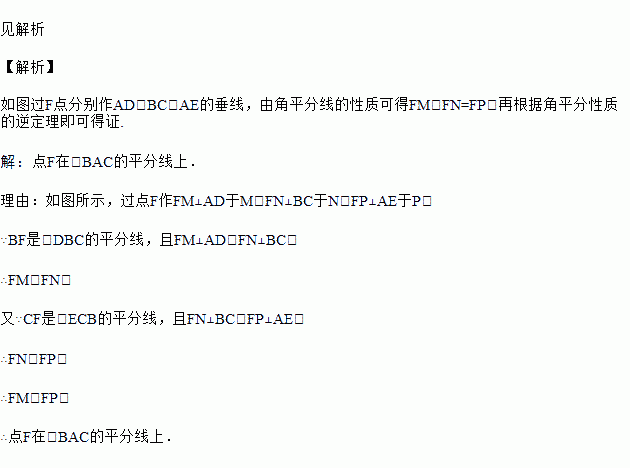 如图所示,BF是∠DBC的平分线,CF是∠ECB的平分线,则点F是否在∠BAC的平分线上?试说明理由.