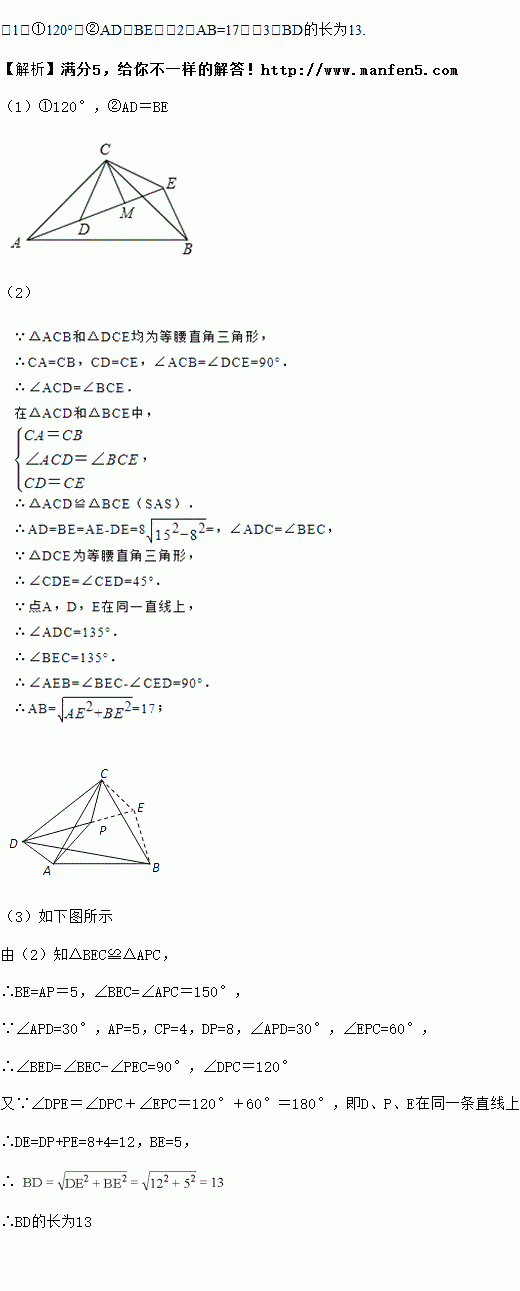 如图2,△ACB和△DCE均为等腰三角形,且∠ACB=∠DCE=90°,点A、D、E在同一直线上,若AE=15,DE=7,求AB的长度.